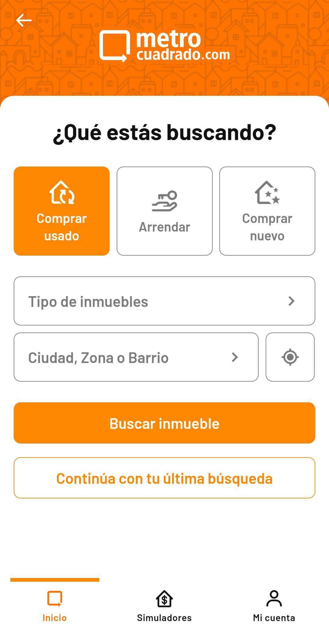 La forma que ya conoces para buscar inmuebles en Metrocuadrado desde tu navegador favorito, ahora está al alcance de tu mano. Escoge el tipo de inmueble que estás buscando entre nuevo y usado, y decide si quieres comprar o arrendar. Además, ahora también puedes filtrar por inmuebles más específicos, incluyendo la posibilidad de buscar apartaestudios para venta o arriendo.