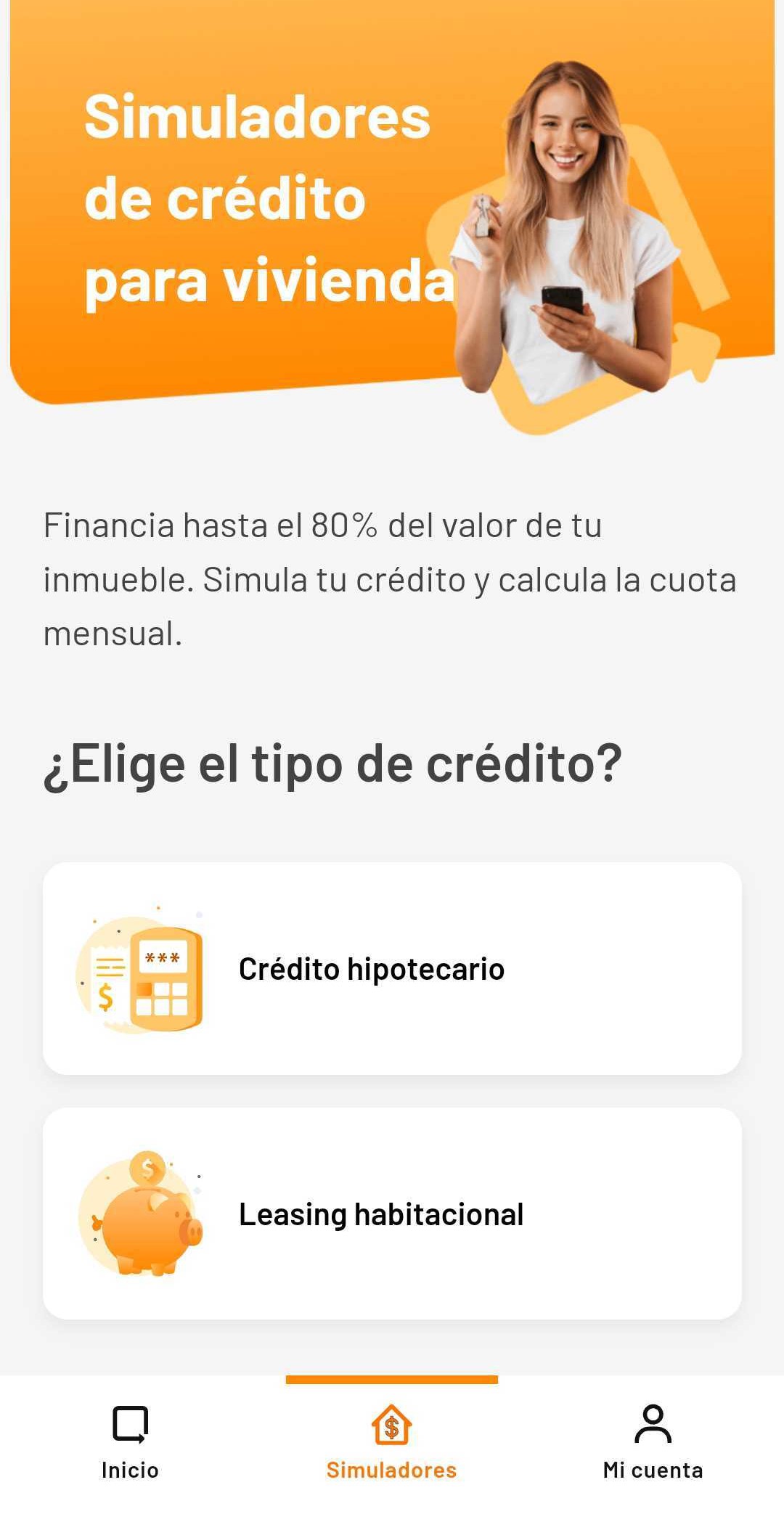 Además, nuestra app ofrece la posibilidad de que accedas a nuestras herramientas de financiamiento. De esta forma puedes simular, en minutos, tu crédito hipotecario o leasing habitacional para hacer realidad el sueño de tener tu vivienda propia.