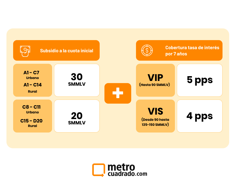 Para hogares de vivienda de interés prioritario (VIP) la cobertura a la tasa es de 5 puntos porcentuales y para vivienda de interés social (VIS) de 4 puntos porcentuales. Esta cobertura se aplica sobre la tasa que se pacte con la entidad financiera al momento de comprar la vivienda.