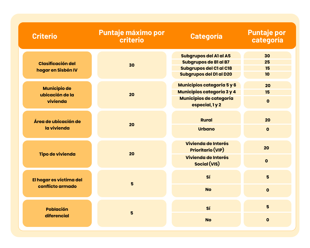 El nuevo sistema consistirá en una asignación de puntajes que va de 0 hasta 100, teniendo en cuenta las características y la ubicación del proyecto de vivienda que desea adquirir. Los subsidios se entregarán a los hogares de mayor puntaje.