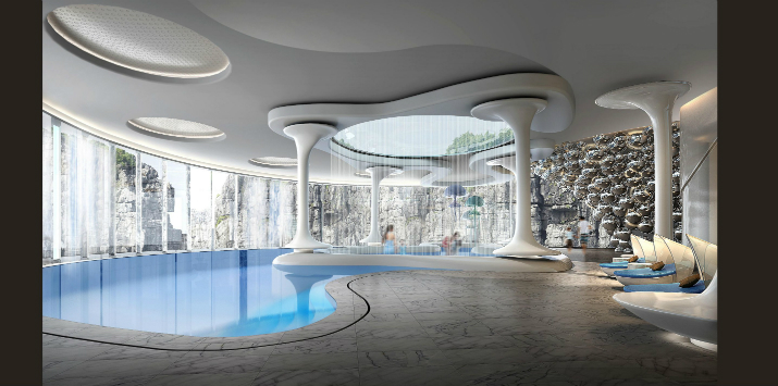El edificio incluye dos pisos bajo el agua y una terraza verde que empata con la cordillera de Sheshan, las habitaciones no sumergidas tendrán balcones con vistas al barranco y a las cascadas artificiales que fueron especialmente diseñadas para el hotel.