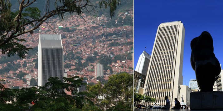Se encuentra en el centro de Medellín. Su construcción inició en 1968, año en el que se demolieron el hotel Europa y el antiguo teatro Junín, la obra concluyó cuatro años después, en 1972; fue el edificio más alto del país hasta 1977 y uno de los más altos de Latinoamérica.