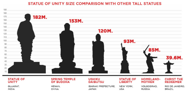 Esta mega estructura fue diseñada por la oficina Michael Graves Architecture & Design. La obra requirió más de 18.000 toneladas de acero reforzado y 1.700 toneladas de bronce, calculadas por los ingenieros de Larsen & Toubro. La obra ha costado aproximadamente 430 millones de dólares y duplica en altura a la Estatua de la Libertad de Nueva York.