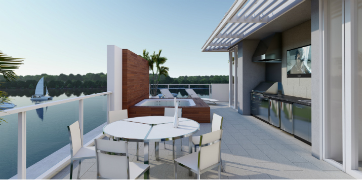 Como parte de los elementos de diseño inspiradores del proyecto hay espacios dedicados al entretenimiento dentro de cada vivienda. Entre ellos todo el quinto piso, que es una terraza equipada con jacuzzi y una cocina exterior totalmente funcional.