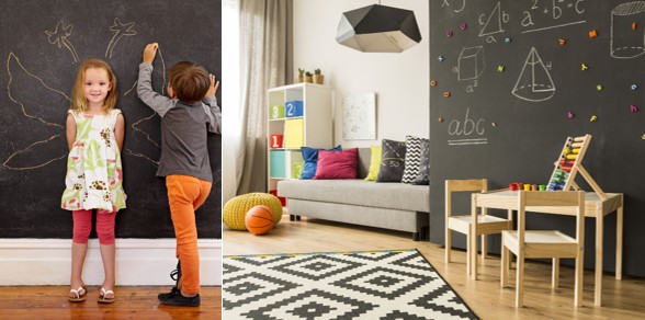 Este es un lugar perfecto para la pintura de pizarra. Que una pared completa o una parte de ella funcione como tablero hará que el cuarto sea más divertido y, además, que los padres estén tranquilos pues el niño puede pintar la pared libremente y sin riesgo de mancharla. Esta es una excelente idea para decorar el hogar.