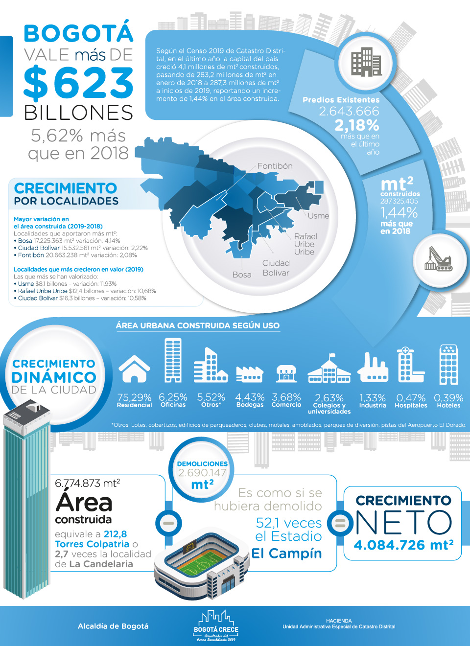 Según el informe del Censo Inmobiliario de Bogotá, vigencia 2019, Bogotá creció 4,08 millones de metros cuadrados en área construida.