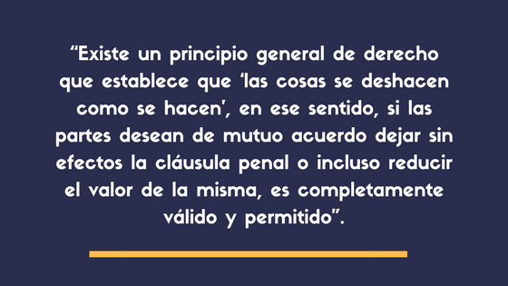 Sin embargo, “existe un principio general de derecho que establece que ‘las cosas se deshacen como se hacen’, en ese sentido si las partes desean de mutuo acuerdo dejar sin efectos la cláusula penal o incluso reducir el valor de la misma, es completamente válido y permitido”.