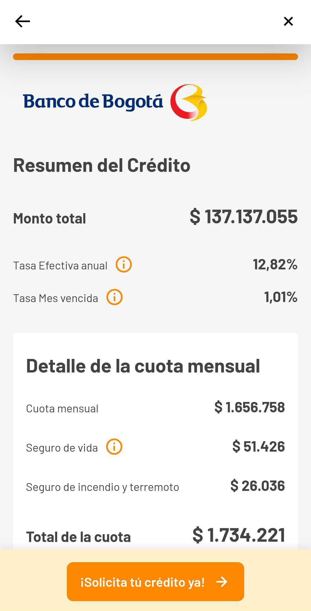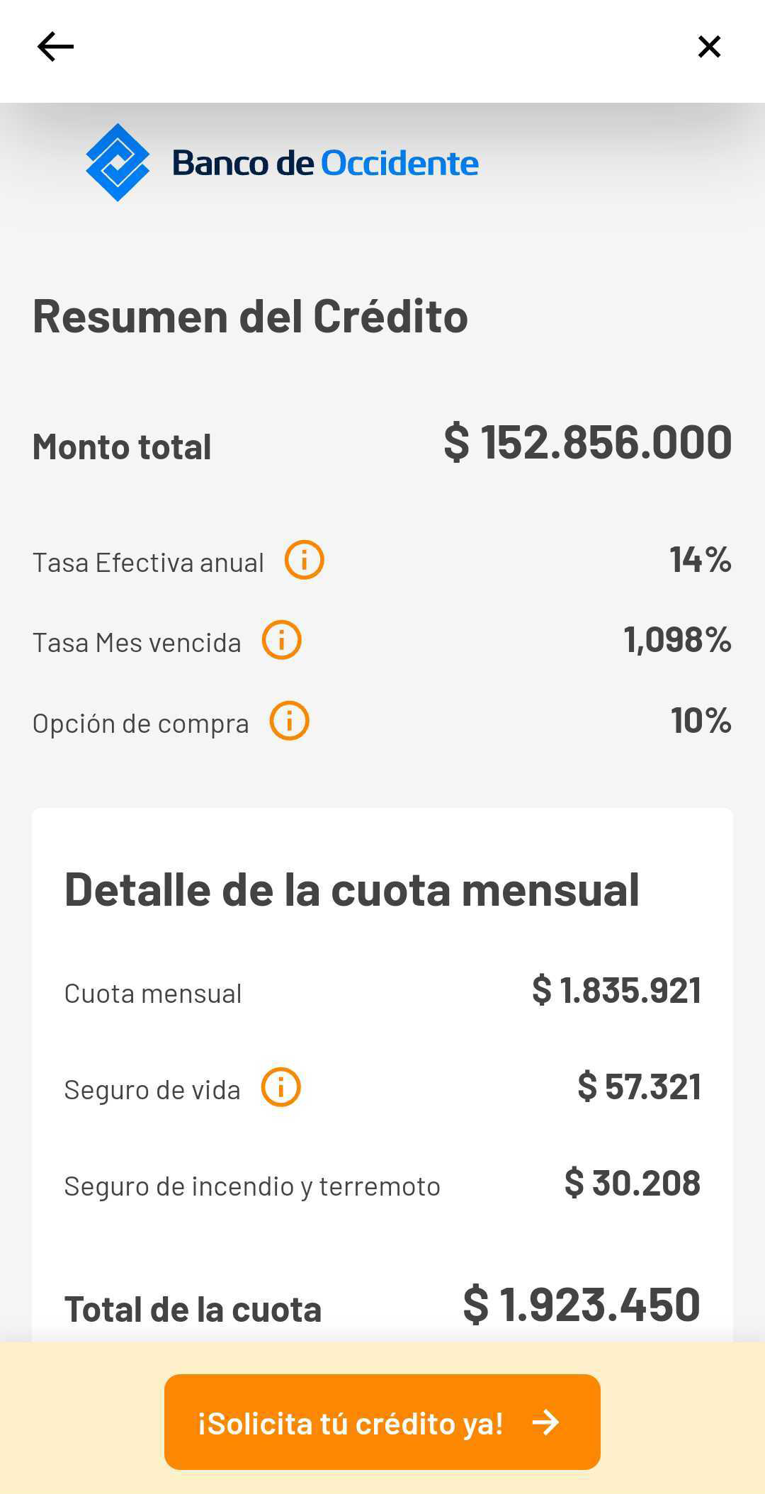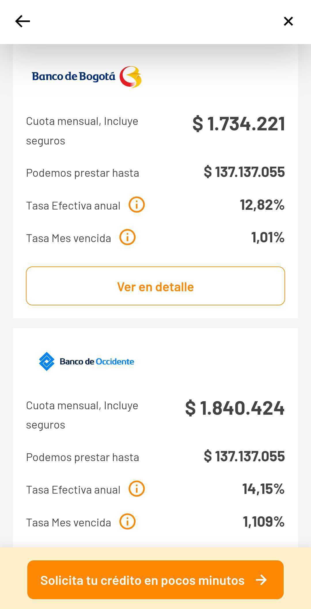 • Una vez escojas la entidad financiera de tu preferencia, puedes ver los detalles del préstamo, incluyendo la tasa de interés, valor de las cuotas, y más.