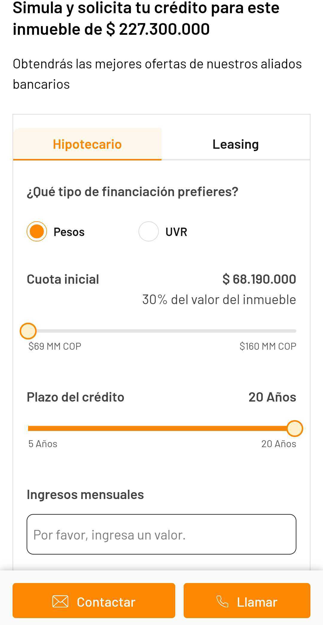 También podrás elegir el tipo de amortización, entre UVR y pesos o, si lo prefieres, simular cómo serían las condiciones de financiamiento si prefieres el leasing habitacional antes del crédito hipotecario.