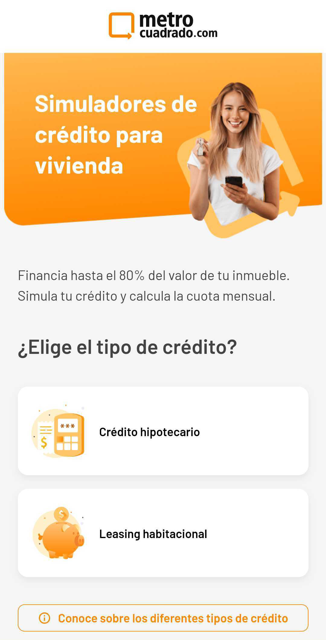 Además, recuerda que no es la única herramienta que tenemos: en nuestro blog de Metrocuadrado ofrecemos noticias, guías y consejos sobre financiamiento de inmuebles, ayudando a los usuarios a entender mejor sus opciones y cómo podrían impactar en su economía.